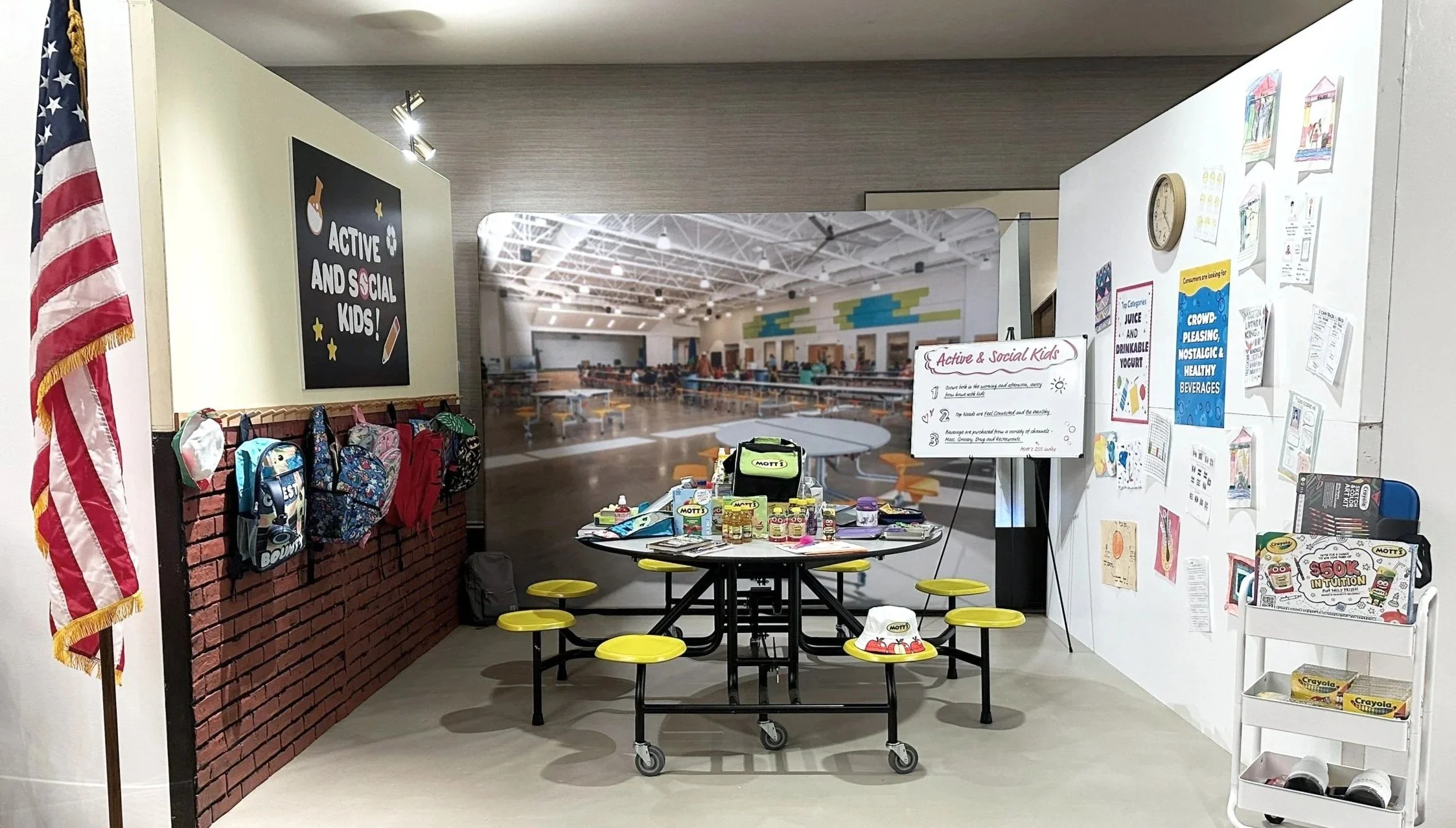 Nestled in the Omni Dallas Hotel’s ballroom foyer, the four suites included a bustling school cafeteria, an upscale restaurant patio, a high-end workout studio, and a calm and serene home scene.